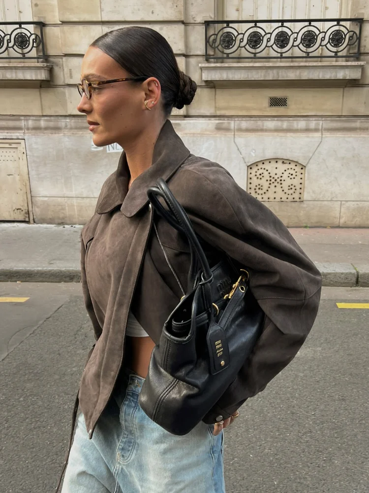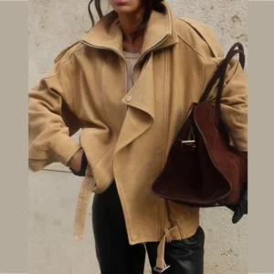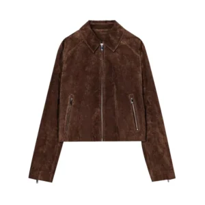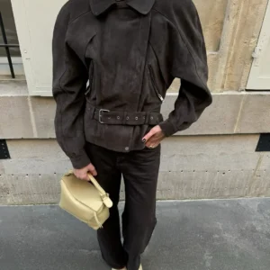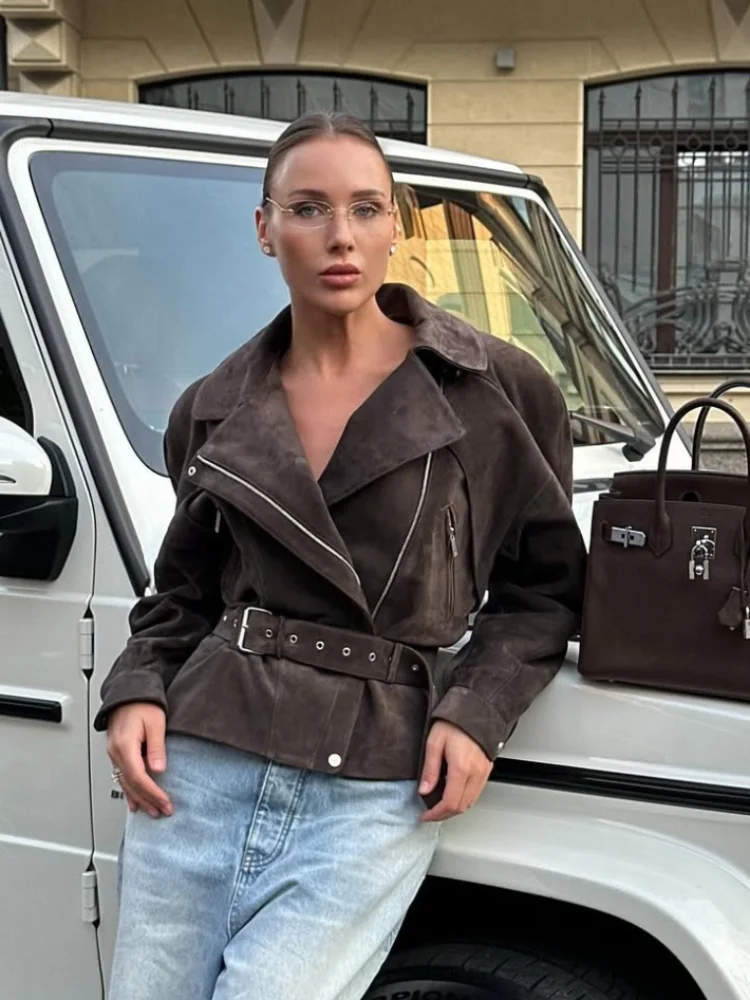 Belts Vintage Women’s Suede Jacket Coat Chic Zipper Lapel Long Sleeve Motorcycle Outwear 2025 Spring Street Chic Lady Top Coats