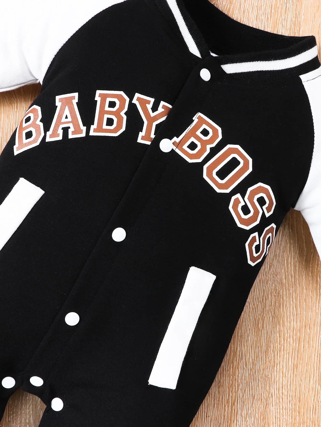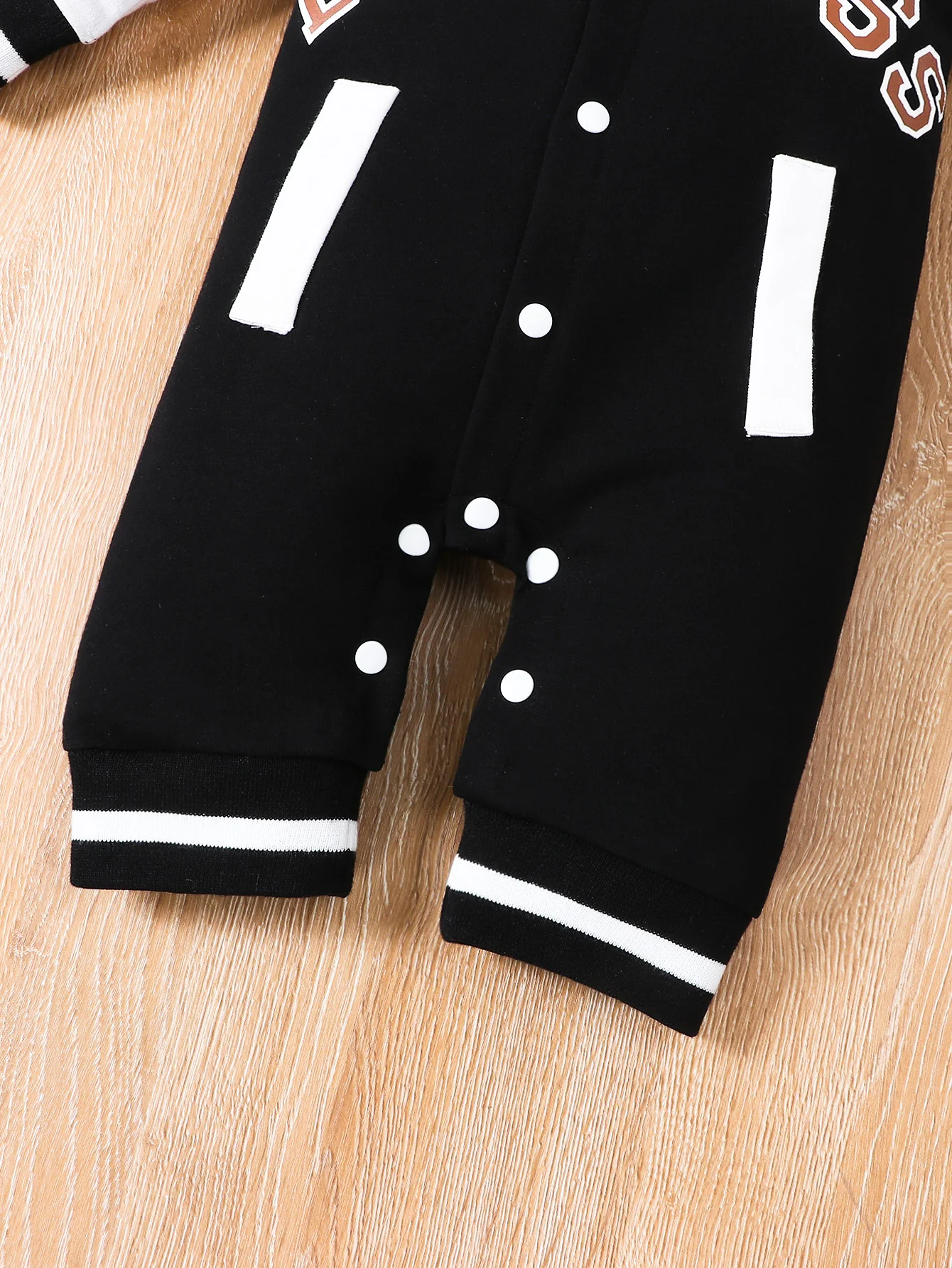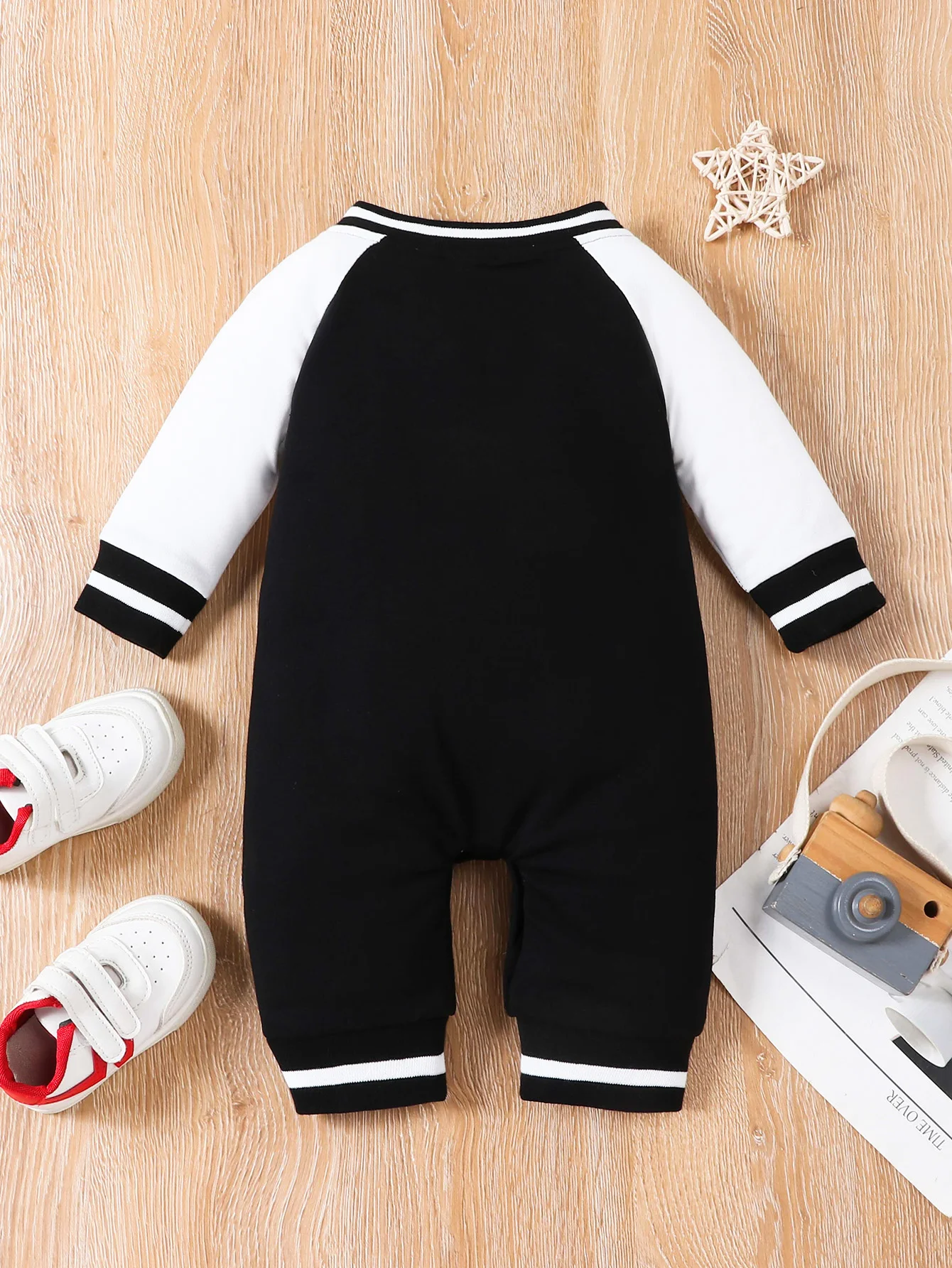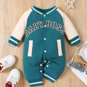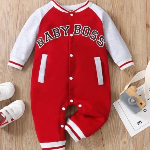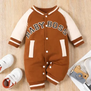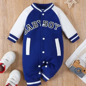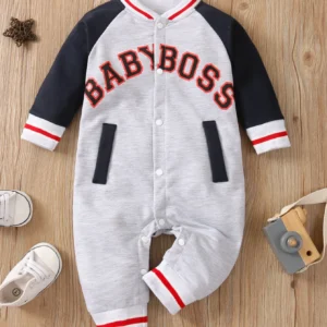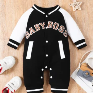 Fashionable letter printed black long sleeved round neck baby boy jumpsuit