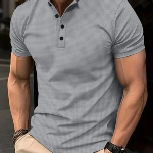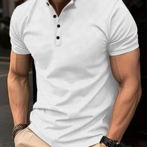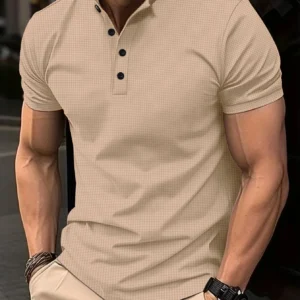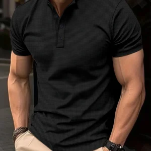 Summer American Vintage Waffle Knit Henry Collar T-Shirt Men’s Fashion Short-Sleeved loose Casual Top POLO Shirt