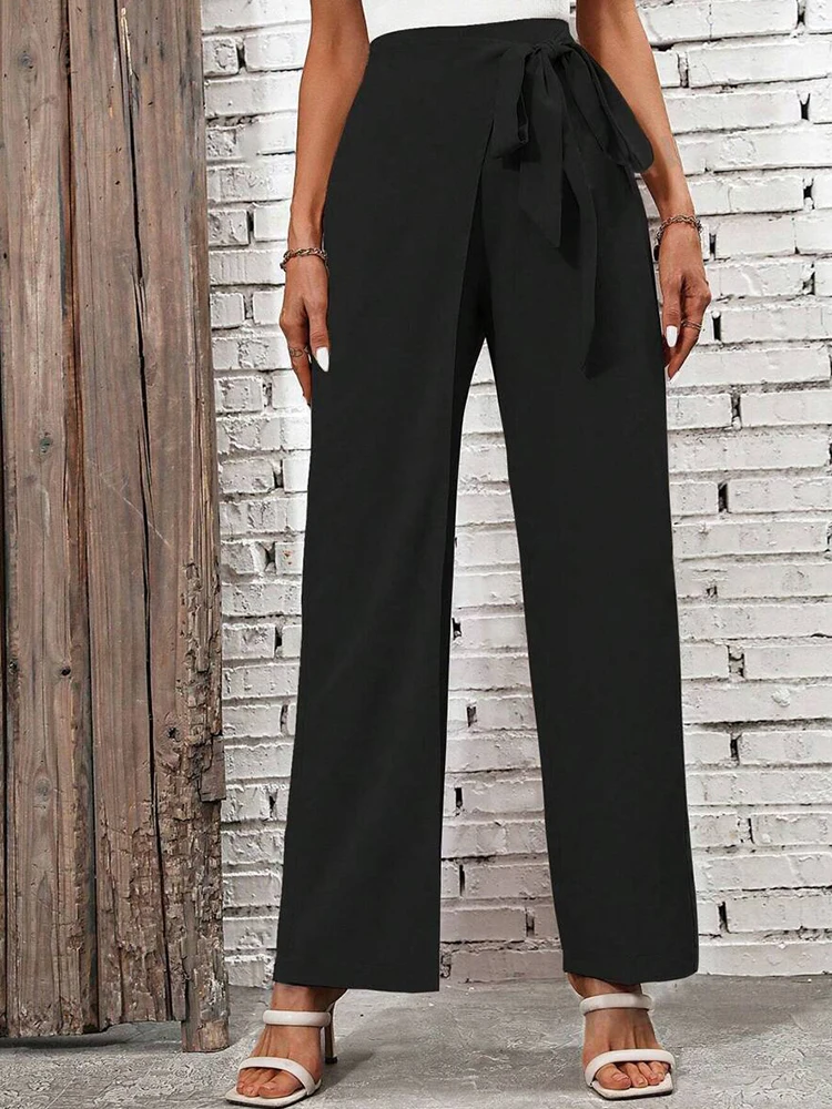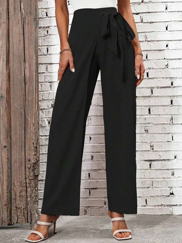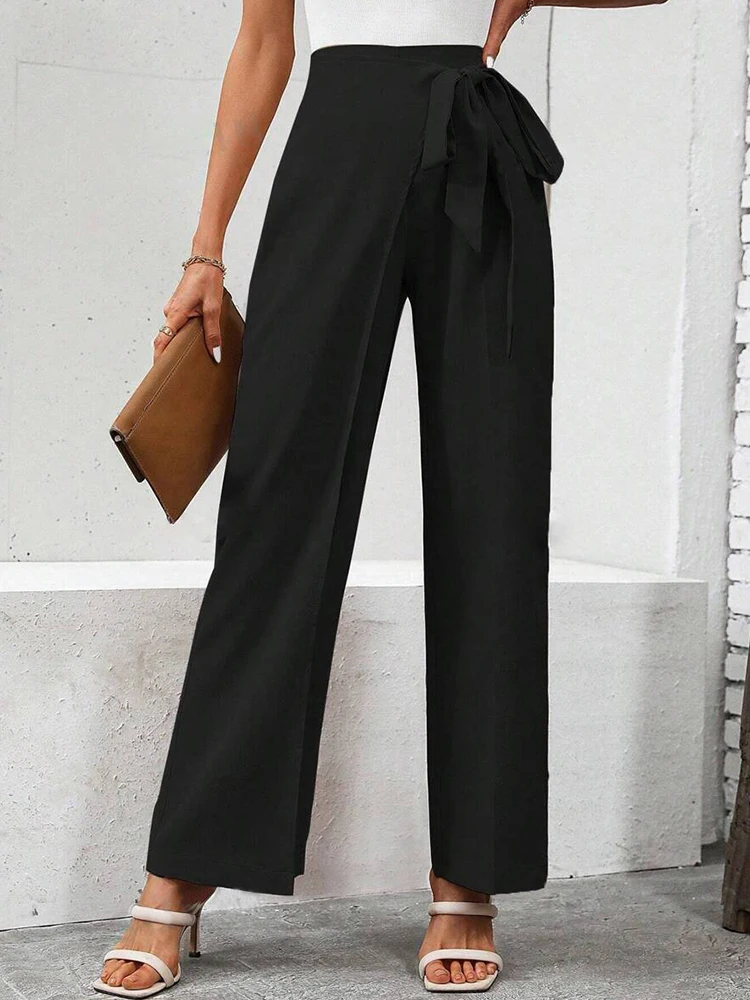 Women’s Spring Autumn New Fashion Elegant Solid Color Pocket Elastic Bow Casual High Waist Loose Wide Leg Straight Long Pants